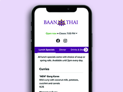 Link to ordering, menus, hours, events, contact, more