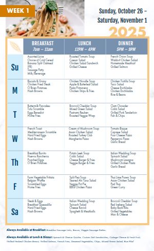 Weekly Letter Sized Cafeteria Dining Hall Menu