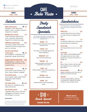 Freshen up your menu design with the Garden Lunch Cafe Menu template. This simple design features a white background with green and purple text and graphics. This menu is great for vegan restaurants, lunch menus, or cafes. Customizing the menu to reflect your business is easy with our design tool. In minutes, edit everything from text to colors to photos. Once your menu looks great, order through our print team and you’ll receive your new menus right to your door.